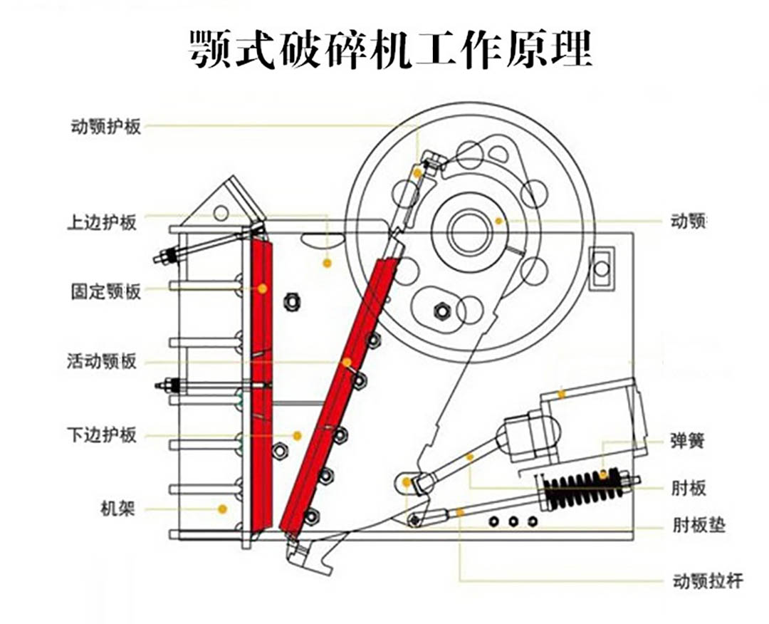 顎式破碎機(jī)由六大部分組成,分別為機(jī)架、傳動(dòng)部分(電機(jī)、飛輪、皮帶輪、偏心軸)、破碎部分(動(dòng)顎、動(dòng)顎板、定顎板)、保險(xiǎn)裝置(肘板、彈簧拉桿部)、調(diào)整部分、潤滑裝置。