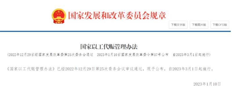 2023年1月19日,國(guó)家發(fā)改委發(fā)布《國(guó)家以工代賑管理辦法》(簡(jiǎn)稱(chēng)《辦法》),自2023年3月1日起施行。